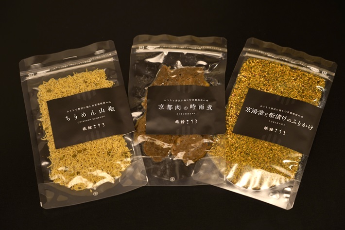 ちりめん山椒、牛肉のしぐれ煮、湯葉と柴漬けのふりかけの詰め合わせで、いずれもご宿泊のお客様に好評の商品です。