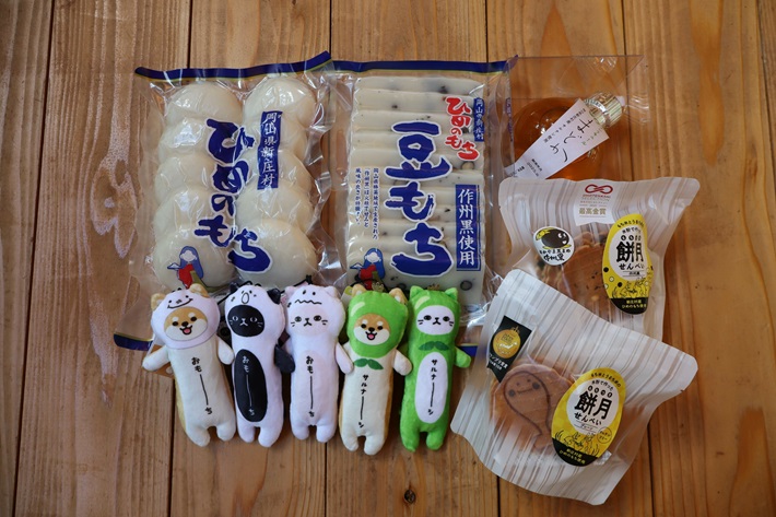 特産品の「ヒメノモチ」を使用した白餅や豆餅や、スーパーフードのサルナシを使用したリキュールやご当地のぬいぐるみまで入ってます♪
