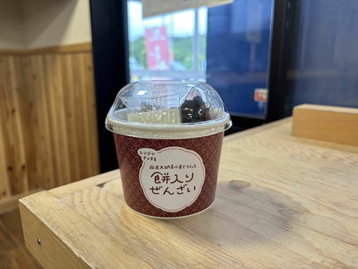 「餅入りぜんざい」は、高級品種の丹波大納言小豆を使用したぜんざいと、切り餅が入っています。これをカップにうつし、電子レンジでチンするだけで本格ぜんざいが楽しめます。