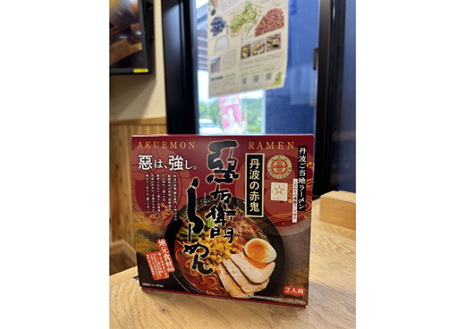 「惡右衛門(あくえもん)ラーメン」は、丹波の歴史や文化、特産物が調和したご当地ラーメンです。こだわりの麺は、兵庫県産小麦60%を使用した小麦粉で、増田製粉様の銘柄「麺司」と「北野坂」をブレンドし、半生麺に仕上げました。