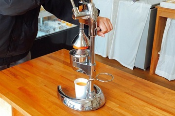 秋津野ガルテンに再集合し、秋津野ガルテン内の体験ブースにてみかんジュース作り体験を行います。先ほど収穫したみかんは使用せず、あらかじめ用意されたみかんを使用します。まずみかんを半分にカットし、カットしたみかんを圧搾機に入れて力を込めて果汁を絞り出します。調味料や添加物を一切使用しない100%フレッシュなみかんジュースをご賞味ください。