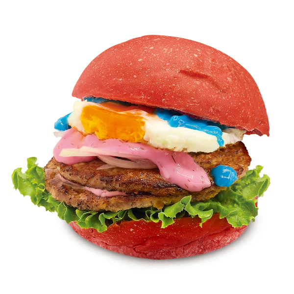 見ているだけでなんだか元気が出てくるレッドバンズで挟んだら、「スーパー戦隊バーガー」の完成!!
