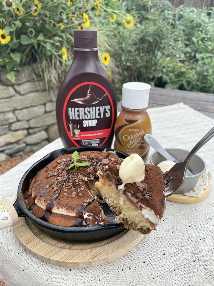 ふんわりパンケーキにマスカルポーネクリームを重ね、薄焼きココアクッキーとほろ苦いココアを振りかけたティラミス仕立て。コーヒーシロップの香りと濃厚なクリームのハーモニーが大人のデザート気分を演出します。仕上げにキャラメルソースかチョコレートソースを選べ、さらにバニラアイスを添えるのもおすすめです。