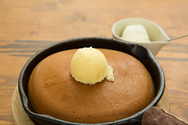 住宅街の中の隠れ家カフェ。たっぷりのたまごを使ったしっとりふわふわのパンケーキに、ほんのり甘いスノーハニーバターとホイップクリームをのせてお召し上がりください。