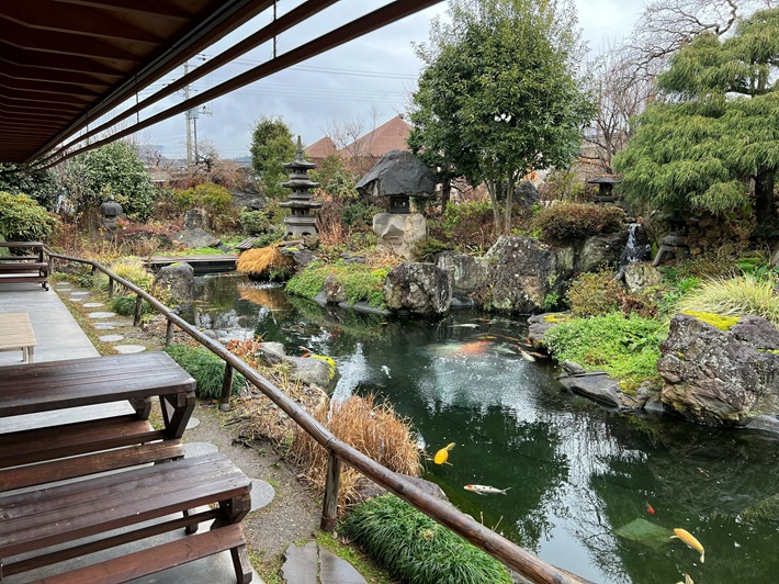 住宅街の中の隠れ家カフェ。池の中をゆったりと泳ぐ錦鯉と庭園を眺めながら穏やかな時間を過ごすことができます。