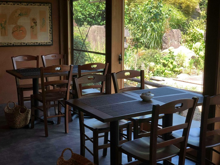 店内は木の温もりを感じる和モダンな空間。大きな窓から差し込む自然光と、庭の景色が心を癒してくれます。お一人での静かな読書時間にも、大切な人との語らいにもぴったりです。