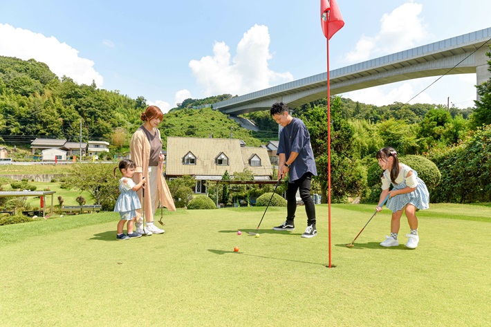 周辺が美しい自然に囲まれた岡崎高原ファミリーゴルフは、パターゴルフ、ショートコースともにまわり放題だから一日楽しめる。
