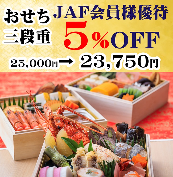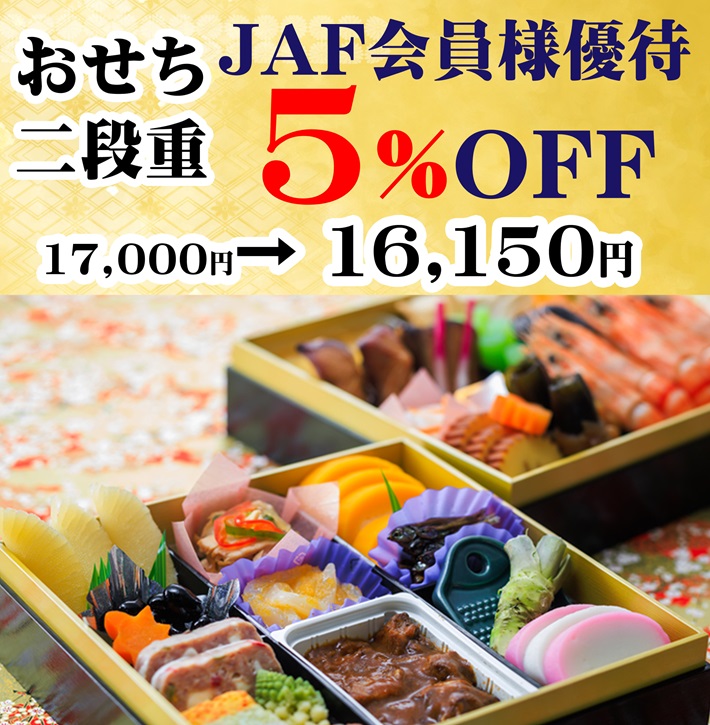 「おせちの購入はこちら」ボタンをタップ(クリック)。JAFナビ記載の「桃中軒ホームページ」から購入。 - 対象人数