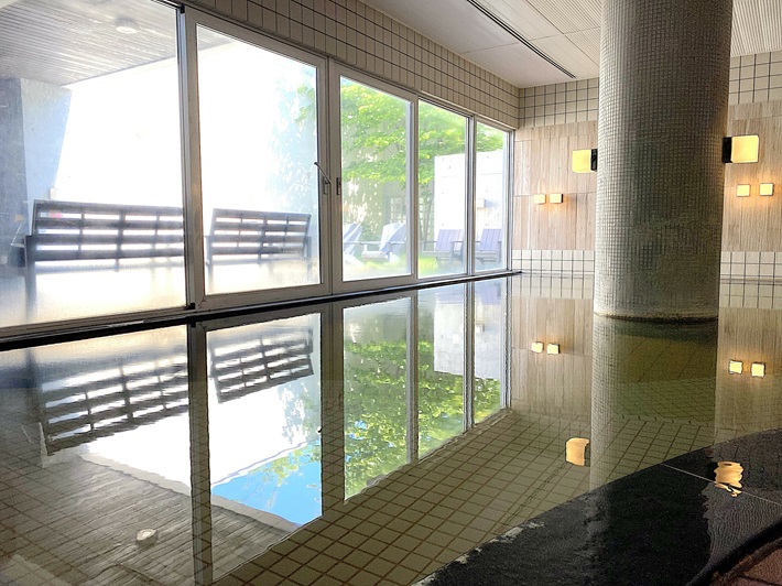 御影石タイルの洋風大浴場と、岩のタイルの和風大浴場。趣の異なるふたつの大浴場は日によって男湯と女湯が入れ替わります。