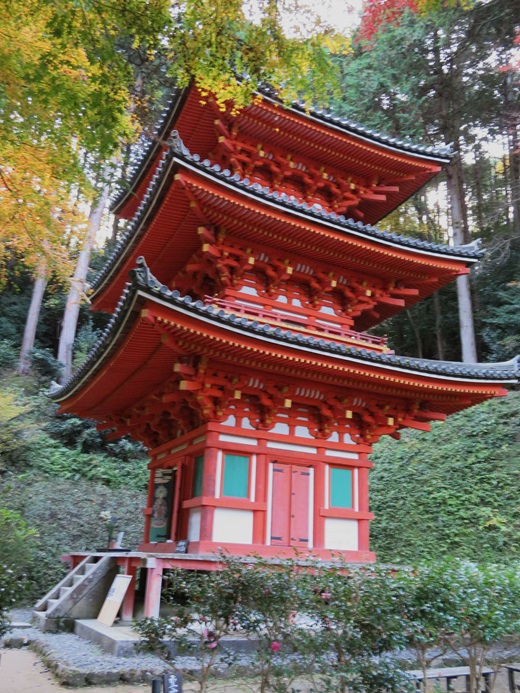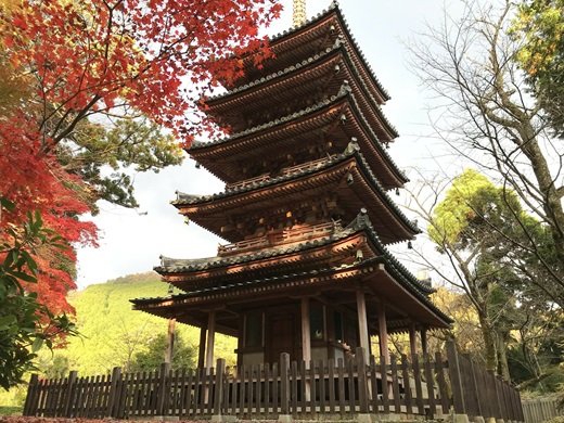 紅葉と三重塔とのコラボレーションが美しい山寺。山門からの切りとられた景色や、裏山へ上ったときの全体の景色など、さまざまな見方を楽しめます。【所在地】木津川市加茂町岩船上ノ門43