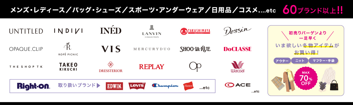 総勢60ブランド以上が出店。業界を代表するアパレル各社のレディース・メンズアイテムと、鞄、靴、革小物、スポーツ・アンダーウェア、日用品、コスメなど最大70%OFF♪冬のバーゲンセールより一足早く、今すぐ使える冬物アイテムを驚きのスペシャルプライスでご用意します♪