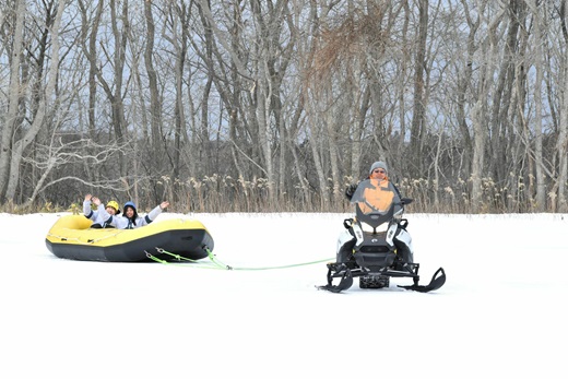 大型のスノーモービルに引かれるゴムボートに乗って、雪上を縦横無尽に周回します。