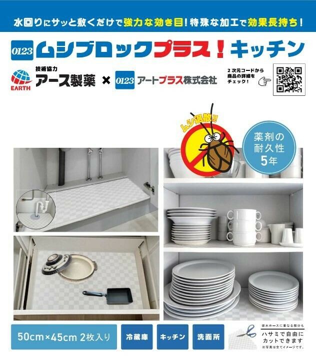 敷くだけで防虫!キッチンの引き出し・シンク下・洗面台まわりに最適なムシブロックキッチンMサイズを20名様にプレゼント。アース製薬と共同開発の「アートオリジナル」の商品です。耐久性は5年と長く、ハサミで好きなサイズにサイズ調整できます。