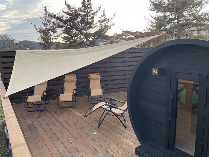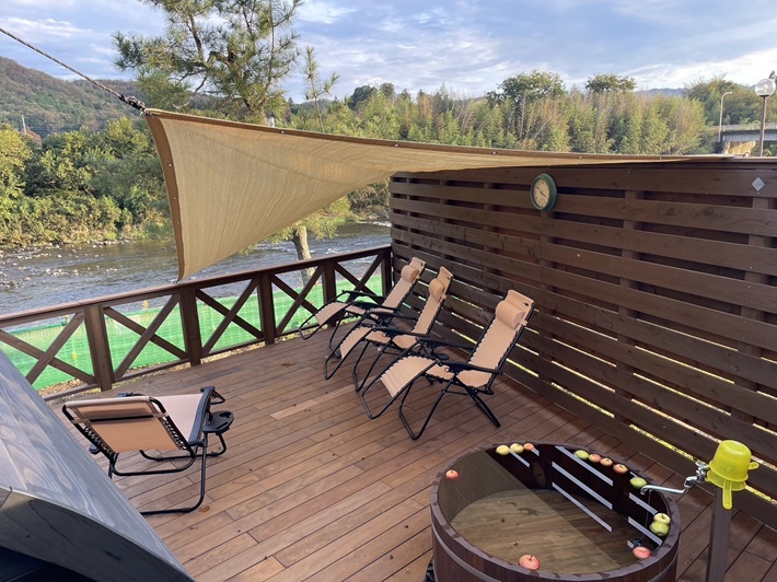 ウッドデッキにはくつろぎスペースとヒノキ造りの水風呂を完備しており、秋の季節は水風呂にりんごが浮かび、