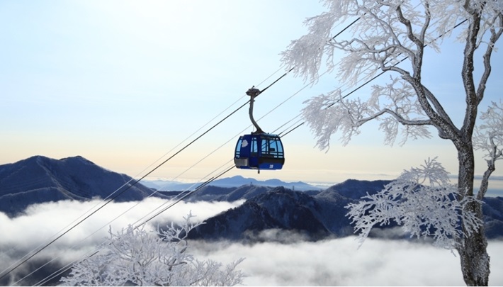 早朝に山頂から眺める景色は一面銀世界