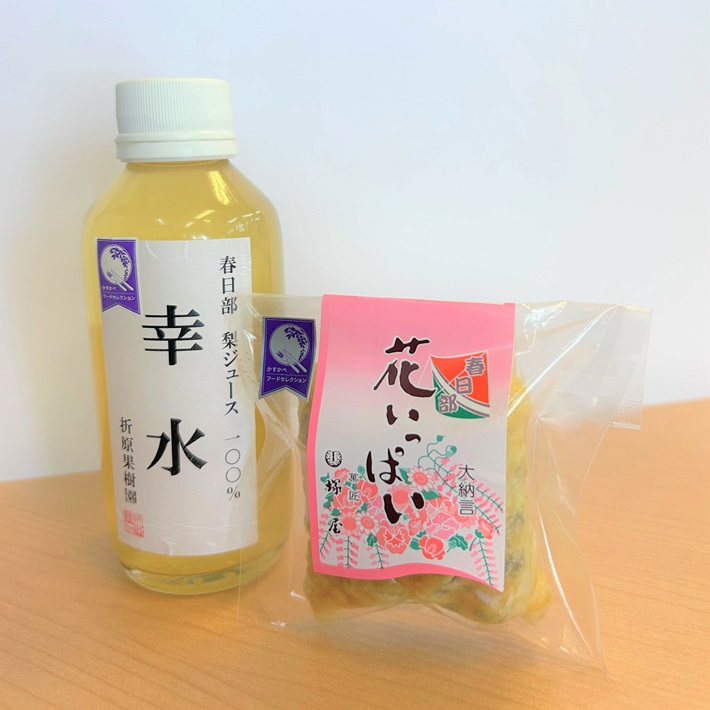 そんな「かすかべフードセレクション」として認定されている折原果樹園の梨ジュース「幸水」と大凧の形をイメージした塚屋の「花いっぱい」を参加者限定お渡しします!