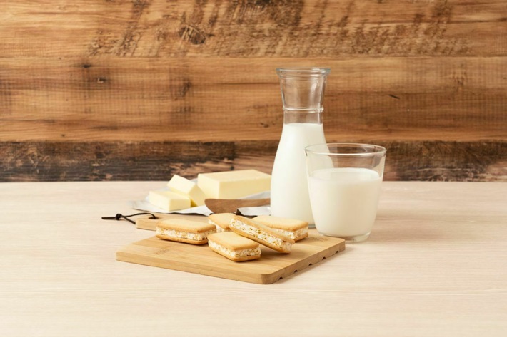 やさしいミルクの香りと、サクサクのクッキー生地。コーンフレーク入りのホイップチョコをサンドした食感も楽しいスイーツです。