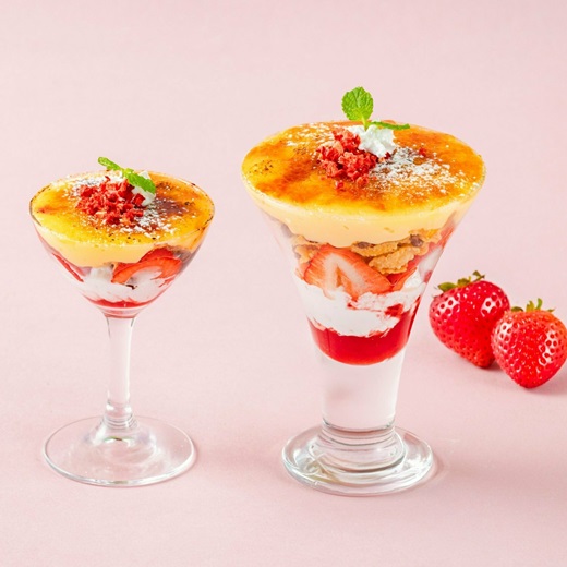 カリッと香ばしいブリュレと、ジューシーな苺を重ねた、デザートの魅力を詰め込んだパフェです。濃厚な甘みと爽やかな酸味が絶妙に溶け合います。