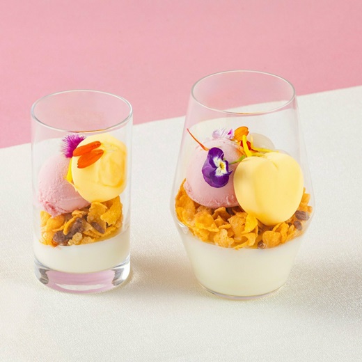 ホワイトデー誕生のきっかけとなった「マシュマロデー」を提案した、博多の老舗和菓子店『石村萬盛堂』。その石村萬盛堂が本パフェのために作った特製マシュマロを主役に、ストロベリーアイスや白玉をパンナコッタの上にのせた、優雅でやわらかな味わいのパフェです。