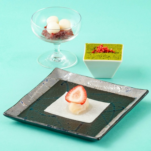 抹茶と苺のティラミス・苺の求肥大福・温かいおしるこ イメージ