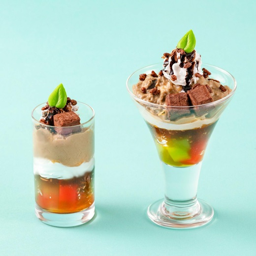 香ばしいほうじ茶ジュレの中に三色の寒天を入れ、見た目にも楽しい一品に。濃厚な生チョコとほうじ茶の香りが調和する、見た目も味わいも奥行きのある和風パフェです。