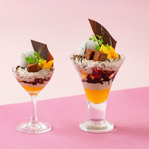 福岡サンパレスが中洲で運営する夜のケーキショップ『ホテルパティスリーufu』の生チョコを使用し、オレンジやオレンジゼリー、チョコアイス、チョコホイップを重ねた特別なパフェです。チョコの深いコクとオレンジの香りが織りなす、バレンタインをイメージした期間限定の華やかな一品。