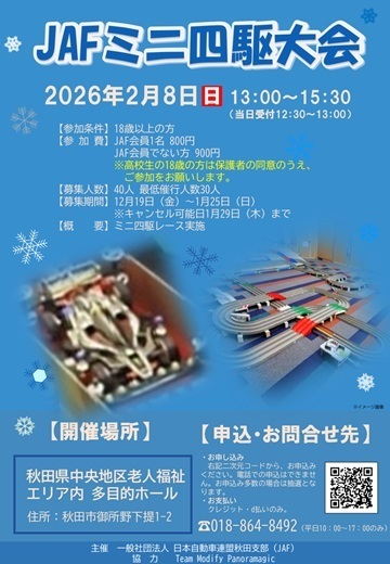 2026年2月8日(日)JAFミニ四駆大会を秋田県内でミニ四駆を盛り上げている団体「Team Modify Panoramagic(略称TMP)」のご協力をいただき、トーナメント形式でレースを行います。