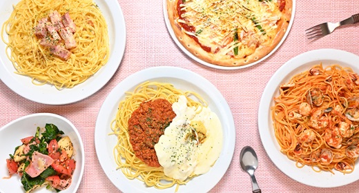 100種類以上のスパゲティや、アッツアツのピザなどのサイドメニュー、そして期間限定メニューもご用意しています。幅広いメニューからお気に入りの味を見つけてみてください。こだわりのパスタは粒度の粗い胚乳部中心のセモリナを使うことにより、デュラム小麦本来の風味や弾力のある食感を実現しました。その透明感ある黄金色の茹で上がりは見た目にも食欲をそそります。