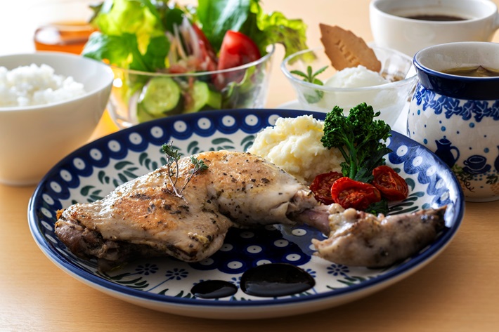 信玄どりの骨付きハーブチキン:信玄どりの骨付きもも肉をじっくりロースト。バルサミコソースがアクセント。