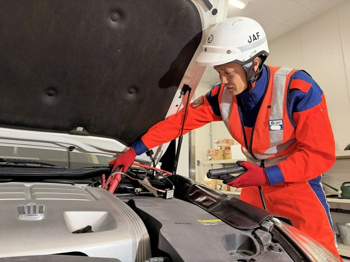 JAFロードサービス検定官の指導のもと、バッテリー上がり対応の手順を学びます。