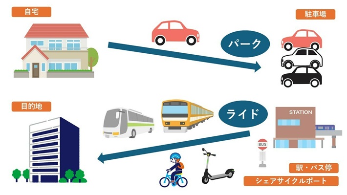 パークアンドライドとは、市街地への自動車の流入を抑制するための取り組みで、市街地周辺の駐車場にクルマを停めて(パーク)、電車・バス・自転車・電動キックボードなどに乗り換えて目的地へ向かう(ライド)移動方法です。