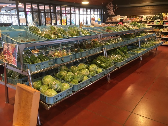 地元で収穫された朝どれの野菜や果物が種類豊富に並んでいます。また、生産者が丹精込めて作った加工品もあり、午後には商品がなくなることもしばしば。