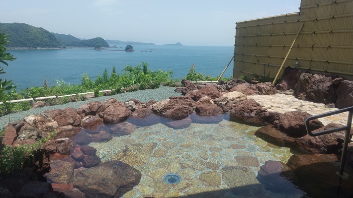 カツオの一本釣りの町として有名な高知県中土佐町にある鰹乃國の湯宿 黒潮本陣。太平洋の黒潮を沸かした汐湯の露天風呂は、雄大な海原を一望できます。
