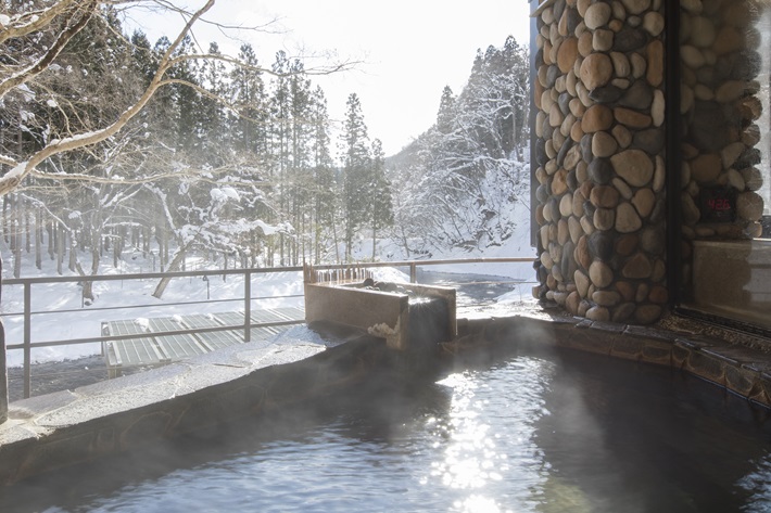 豊沢川の景色を眺めながら温泉を満喫できる「川の湯」、四季折々の庭園の景色を楽しみながら温泉に浸かれる「山の湯」、森の木々の中で森林浴気分を味わえる「森の湯」。3つの大浴場で17の個性性的な湯船をお楽しみいただけます。