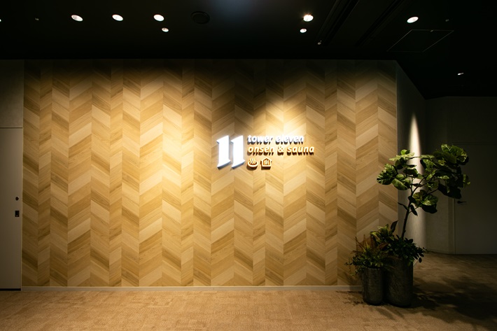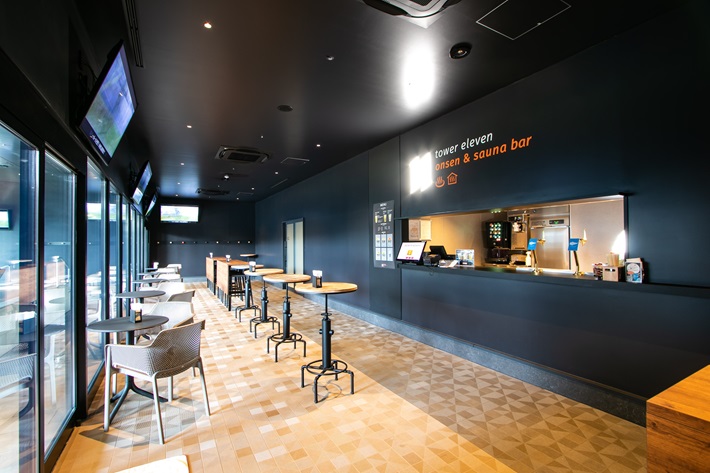 フィールドを望む温泉とサウナを楽しめる「tower eleven onsen & sauna」。