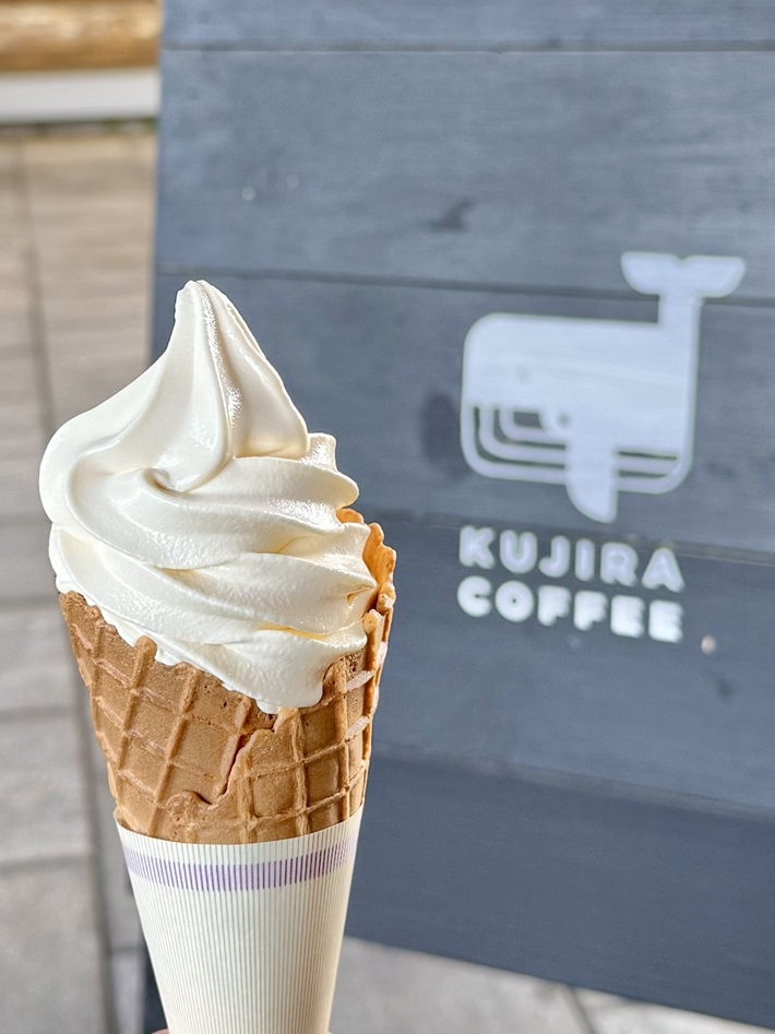 道の駅ビオスおおがた内にあるひなたやカフェ「KUJIRA COFFEE」は、ドライブ途中の立ち寄りにぴったりな、あたたかみのあるカフェです。中でも注目したいのが、人気のソフトクリーム 「ミュクレ(バニラ)」。