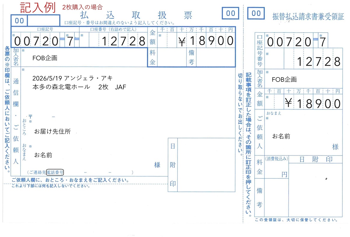 [通信欄]「公演日(2026年5月19日)、アンジェラ・アキ、会場名(本多の森北電ホール)、申込枚数、JAF」を記入