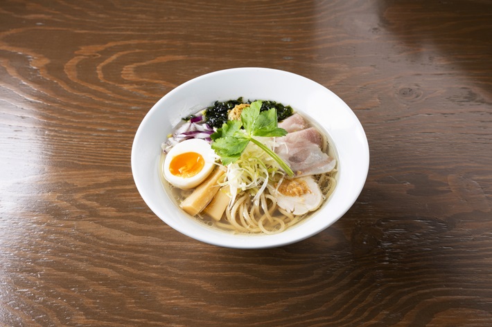 一照庵自慢の鶏スープに、ハマグリ、アサリ、しじみの出汁をブレンド。香味油は芳醇な香りのホタテ油。