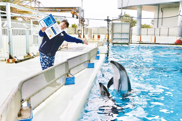 バンドウイルカとあくしゅした後、ごはん(お魚の切り身など)を2個あげることができる、スペシャルプランです♪