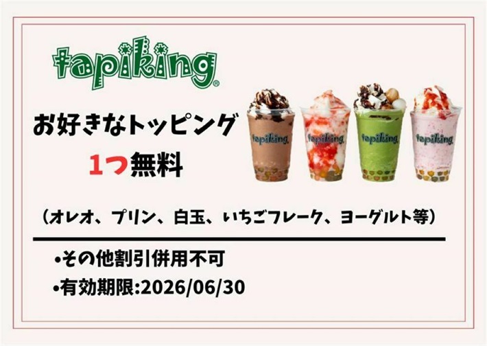 タピキング(7店舗)【お好きなトッピング1つ無料】