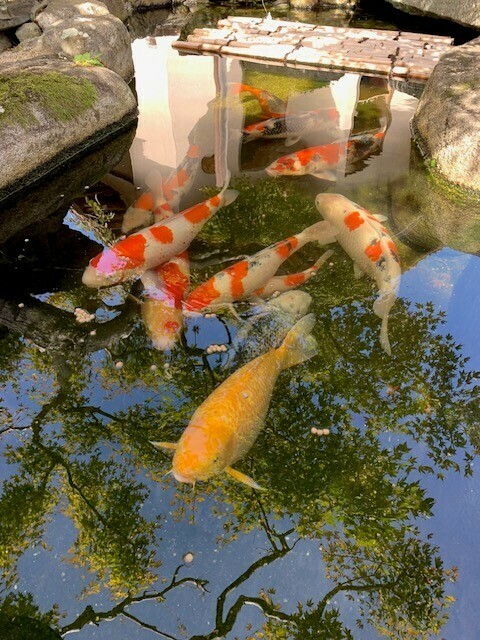 風情のあるお庭は、四季折々の花や木に囲まれており、心が落ち着きます。池では、大きな鯉が泳いでいます。