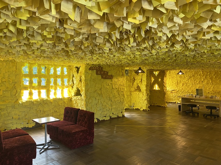 来場者が記念に書き残した黄色のメッセージカードが室内にびっしりと貼られています。