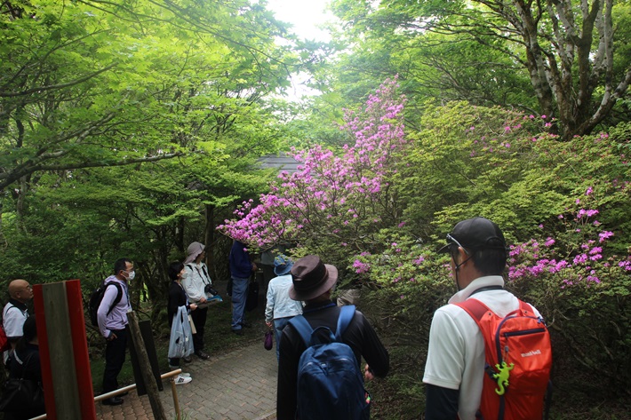 11:00 鶴見岳の植生についてガイドさんからお話を聞きながら、ミヤマキリシマの咲いているエリアまで移動します。