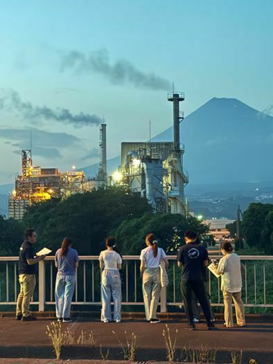 8月6日(水)に、富士市の工場夜景巡りスタンプラリーのポスター制作のため学生4人とともに、6カ所のスポットを見学してきました。最初に立ち寄った「富士市役所」では、このスタンプラリーの主催者である富士市担当者と合流し、富士市の魅力や、ポスター制作に関する意見交換を行いました。その後、6カ所のスポットを全て視察しました。最後に立ち寄った「日本製紙(株)富士工場(吉永)」南側の新滝川橋では、美しい富士山と工場夜景の素晴らしいコラボレーションを見ることができました。