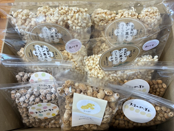 「障がい者就労継続支援事業所アスノワ」が製造・販売するポン菓子です。パスタを使用した珍しいポン菓子なども取り扱っています。