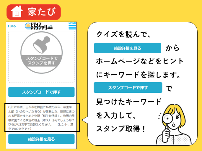 「家たび」とは、家にいながらスマートフォン1つで観光気分を味わえるスタンプラリーです。各コース各立ち寄りポイントのホームページをヒントに「キーワード」を集めてスタンプを取得すると、プレゼントに応募できます。