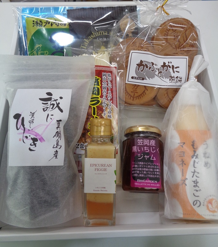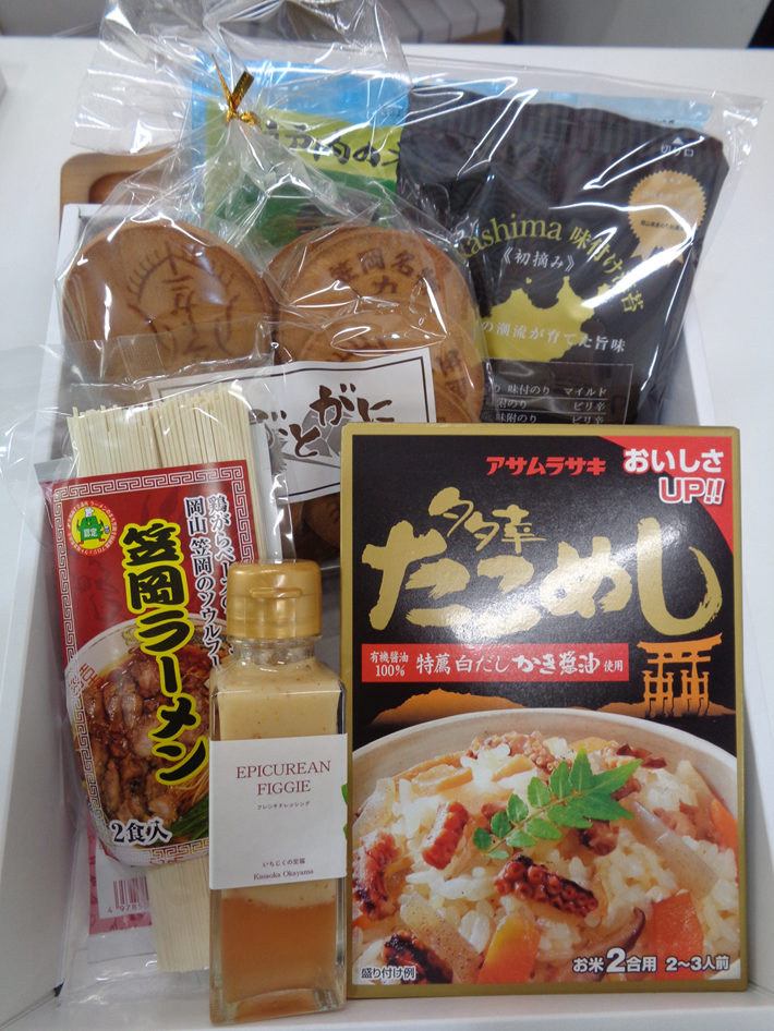 たこめし素、かぶとがに煎餅、笠岡ラーメン、ドレッシング、のりが入った笠岡の特産品詰合せセットです。常連さん賞 ※賞品は選べません