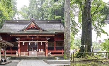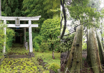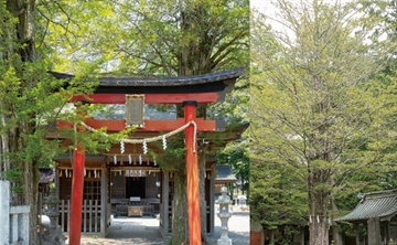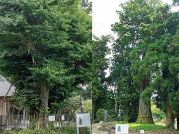 静岡県の天然記念物に指定されているスギの大木二本が寄り添って真直ぐに伸び二本とも根周り6m以上、樹高34m以上ある。