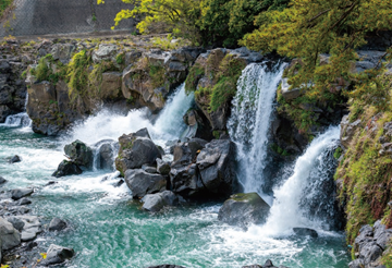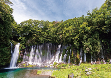 高さ20m、幅150mの絶壁から富士の湧水が幾筋も流れる姿は圧巻。