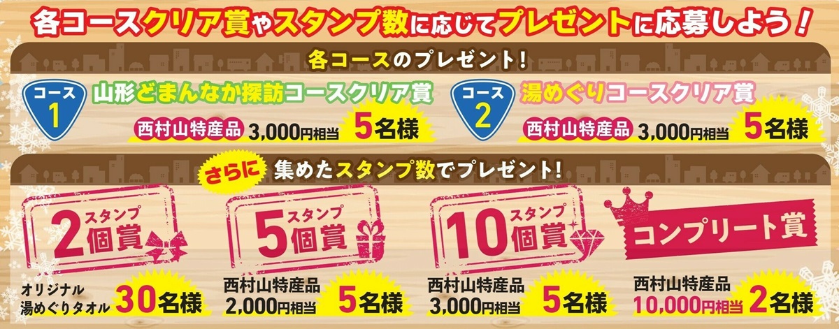 観光施設や道の駅、温泉施設などを巡ってスタンプを集めると、西村山エリアの特産品などが当たるプレゼントに応募できます。